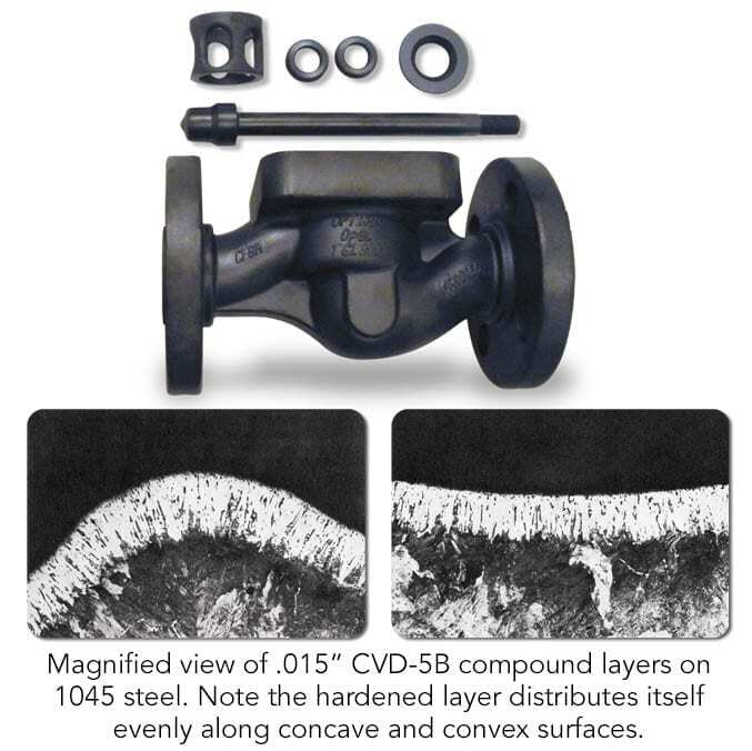 Industrial customers have increasingly demanded that process control equipment also be wear-resistant and capable of sustaining higher temperatures, and CVD-5B was developed as a cost-effective alternative for addressing these process control issues. Unlike coatings and traditional hard facings that harden only the surface of the substrate material, during the CVD-5B hardening process, superheated boron atoms are diffused fairly deep into a host surface to form a metal boride layer that permeates evenly up to .015’’.